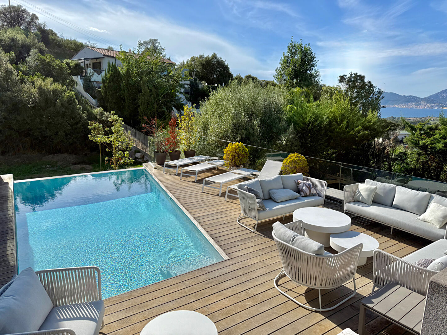 A l’extérieur, le raffinement se prolonge : une piscine aux lignes pures sécurisée par un garde-corps en verre, des jeux d’éclairage subtils intégrés au sol, et une terrasse propice aux soirées d’été face au maquis et au soleil couchant.Les prestations sont complétées par un garage double, deux vastes caves, ainsi qu’un potentiel d’extension permettant d’adapter la propriété à vos projets.