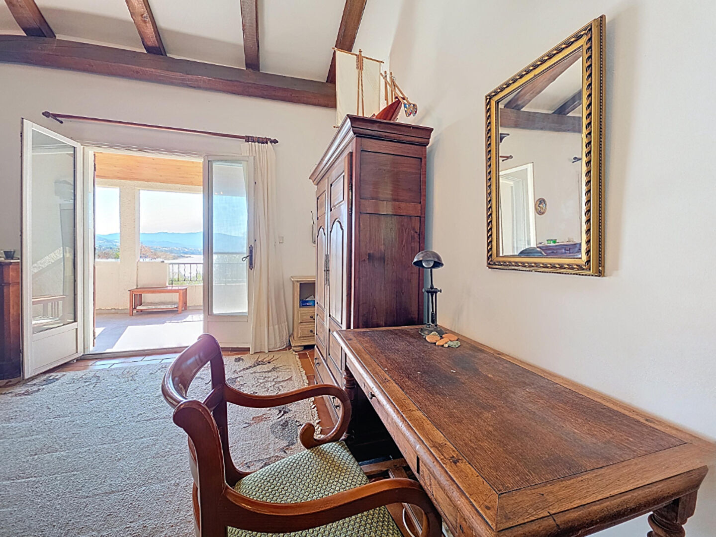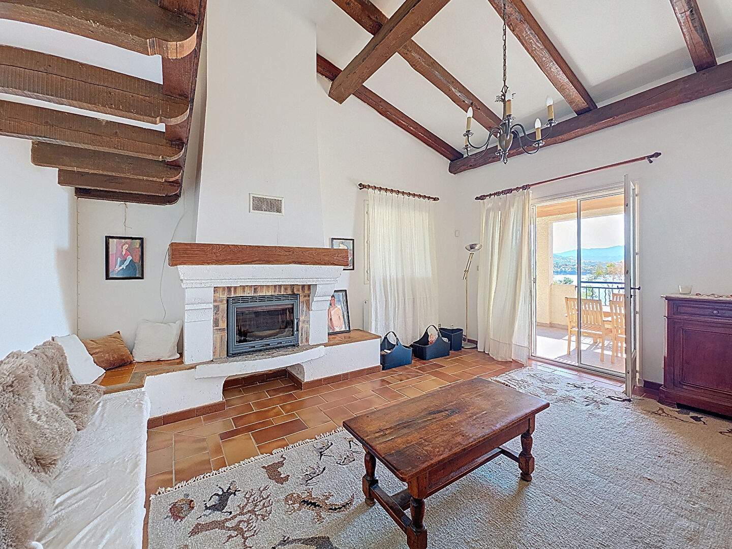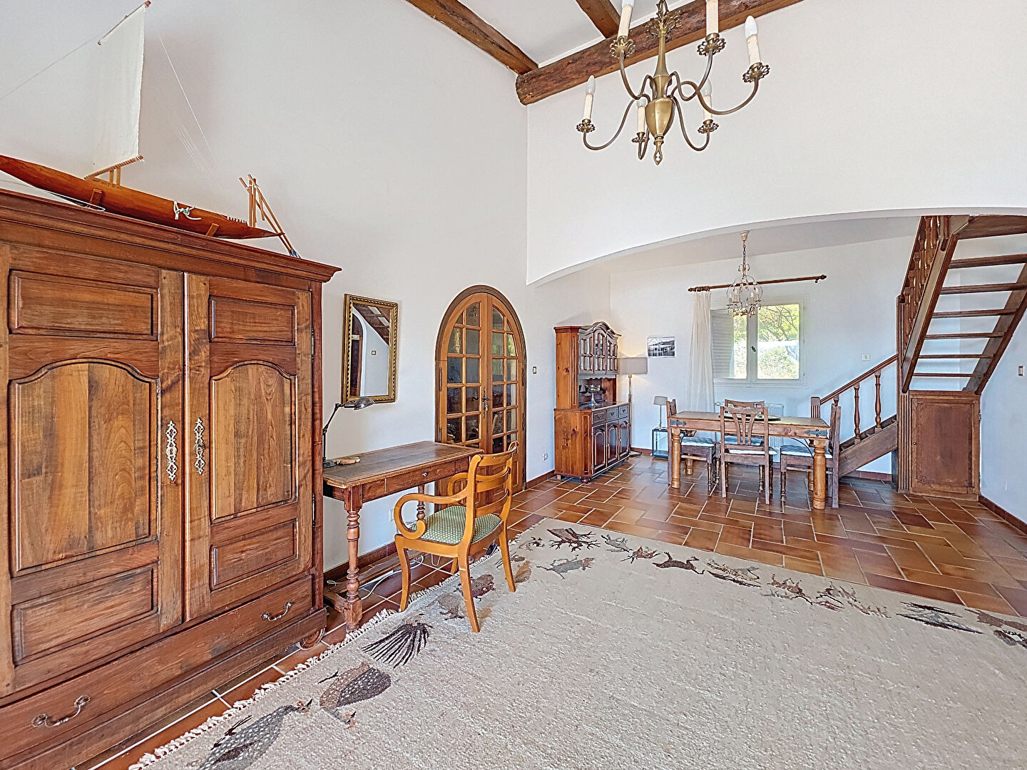 – d’une partie principale distribuée de la manière suivante: un hall, un wc visiteur, un coin jour composé d’un salon avec double hauteur et mezzanine, d’une cuisine, le tout donnant sur une terrasse couverte avec une vue mer à 180 degrés. La partie nuit se compose de 3 chambres et de 3 salles d’eau.