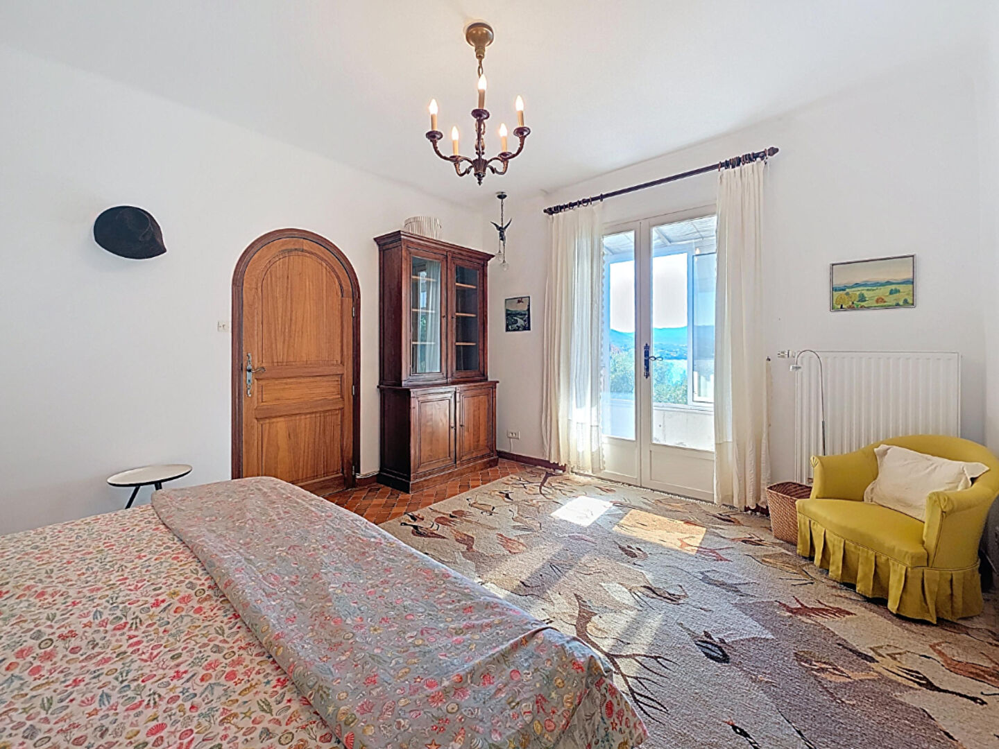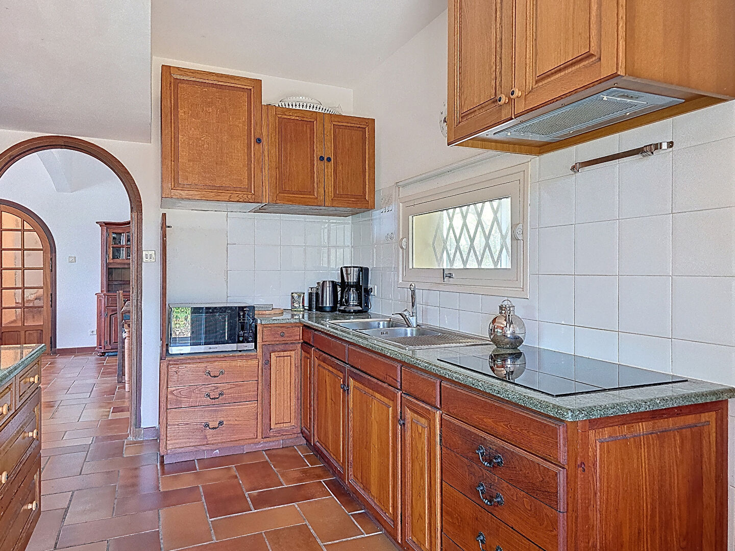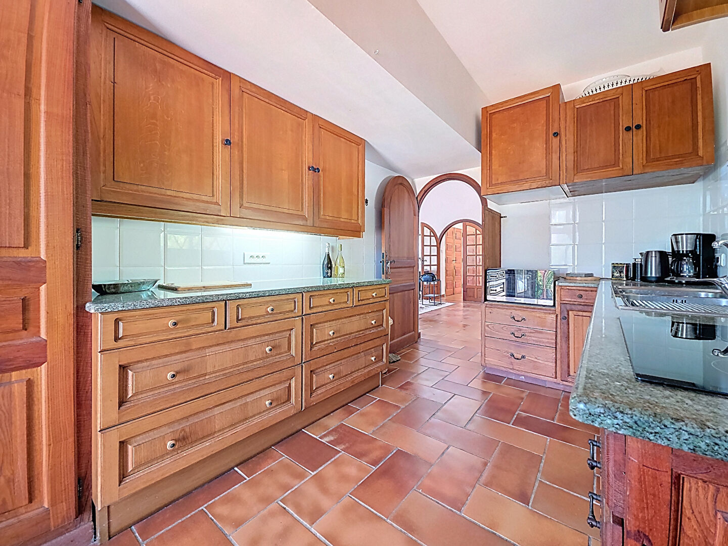 – d’une partie principale distribuée de la manière suivante: un hall, un wc visiteur, un coin jour composé d’un salon avec double hauteur et mezzanine, d’une cuisine, le tout donnant sur une terrasse couverte avec une vue mer à 180 degrés. La partie nuit se compose de 3 chambres et de 3 salles d’eau.
